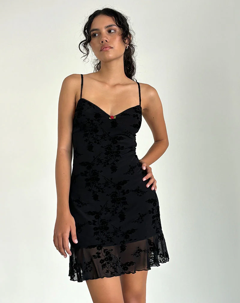 Motya Halterneck Mini Dress in Floral Rose Flocked Black